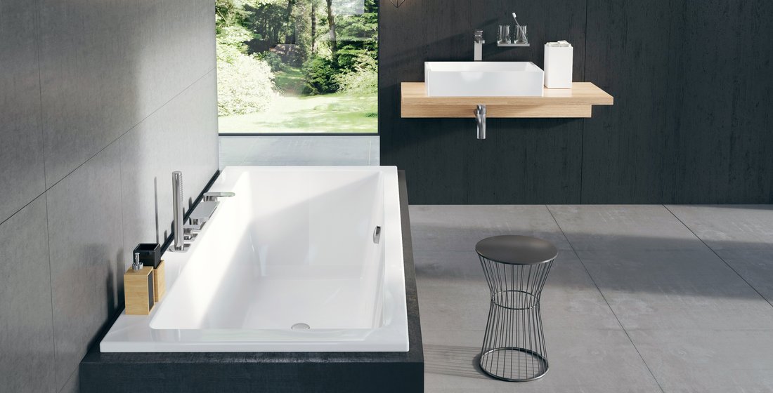 Минималистичный набор умывальника и ванны с элементами умеренной асимметрии.